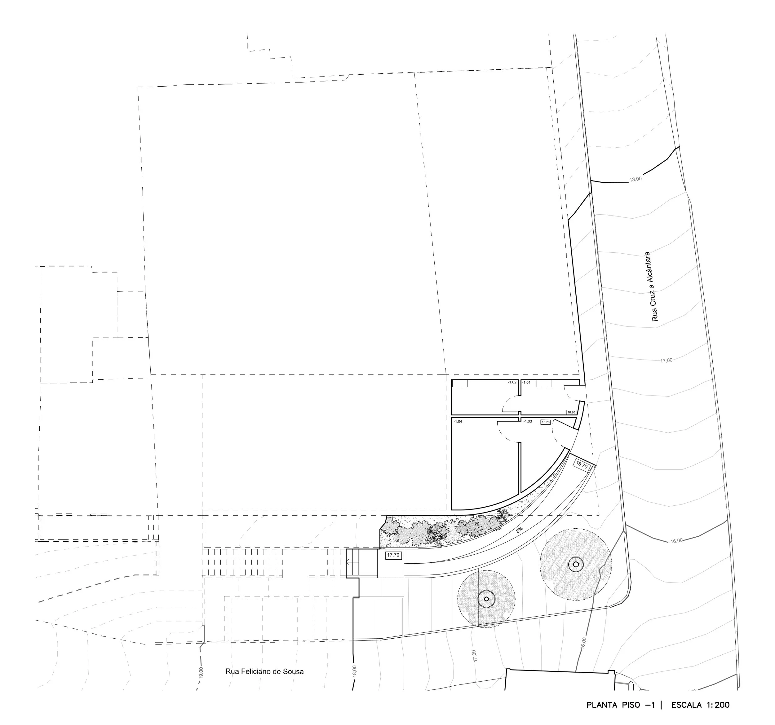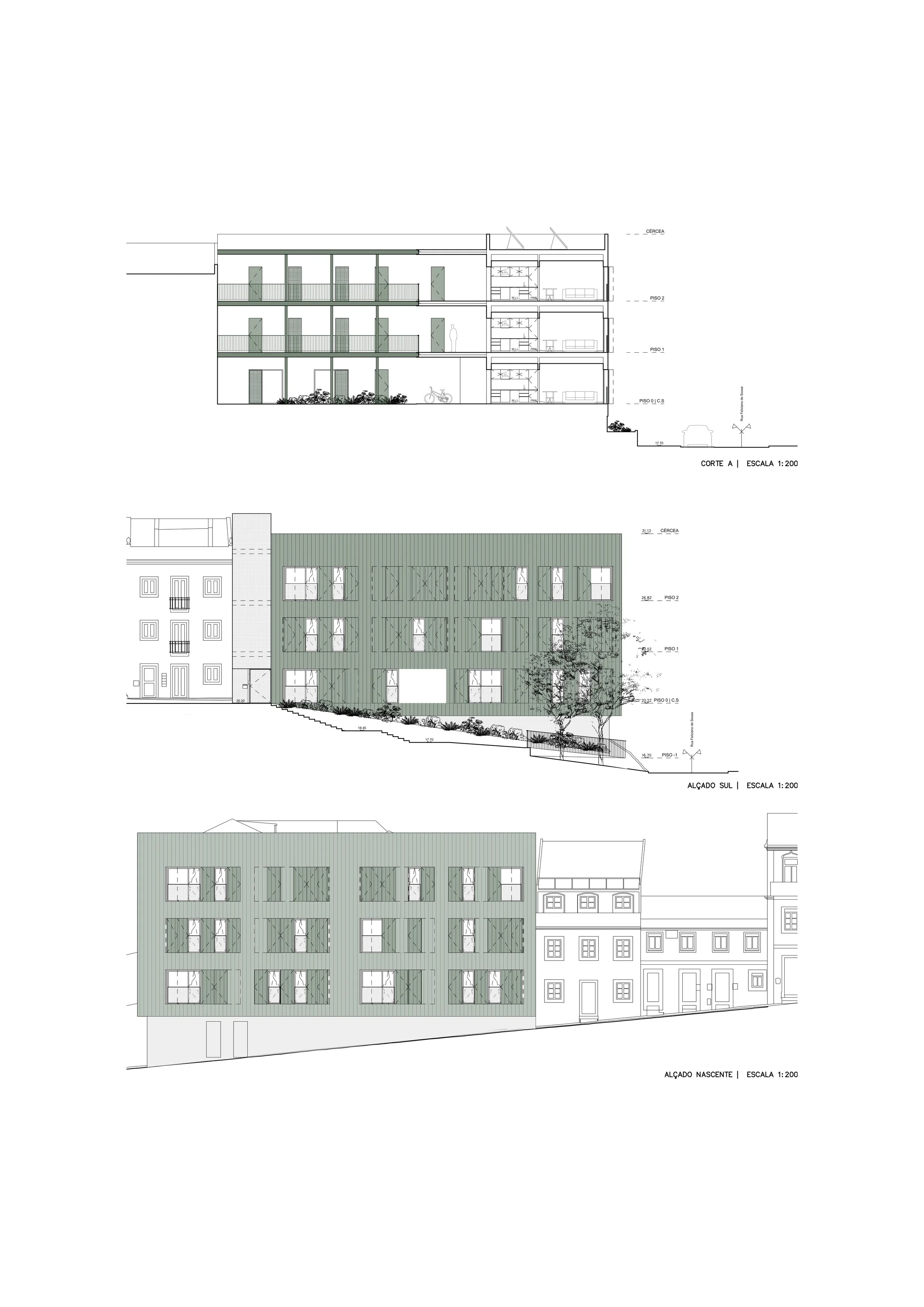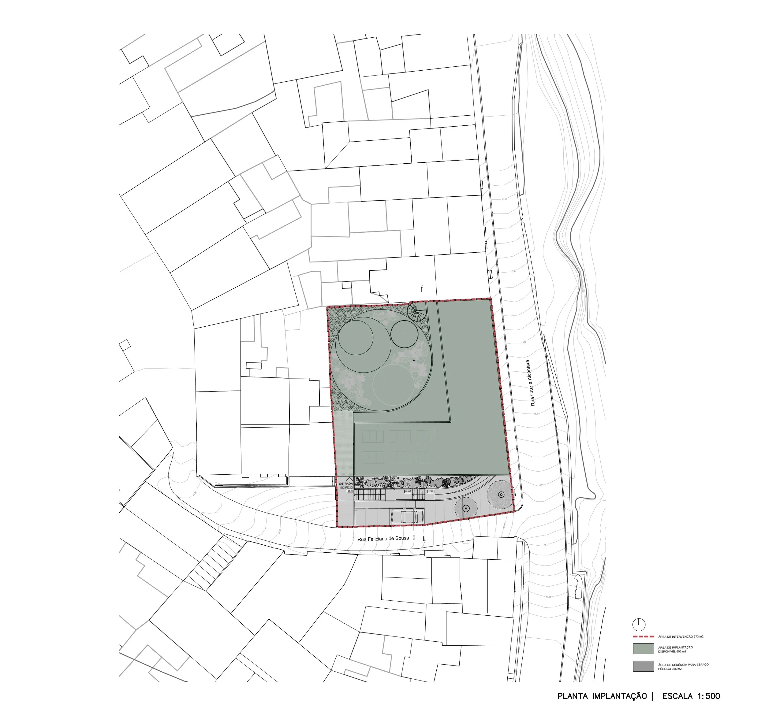 A proposta implanta-se em continuidade com os principais eixos da malha urbana existente, assegurando uma integração harmoniosa com o tecido envolvente e uma circulação fluida entre as duas ruas que delimitam o lote.
