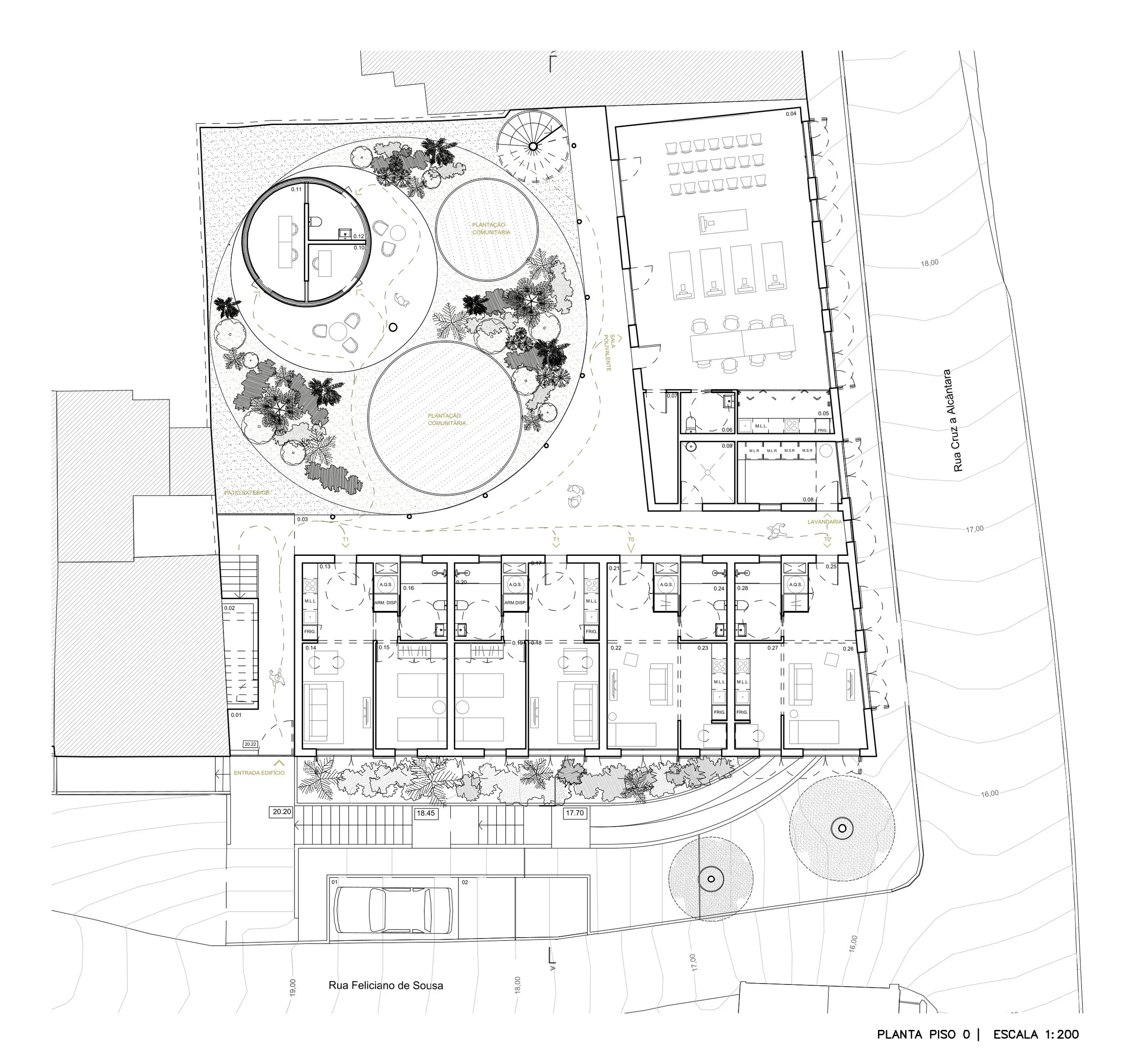 Destinado a pessoas em situação de vulnerabilidade social, o conjunto apresenta duas faces complementares: uma exterior, que assegura a privacidade dos residentes, e uma interior, voltada para o Páteo, que promove a interação entre moradores e comunidade através de espaços de integração.